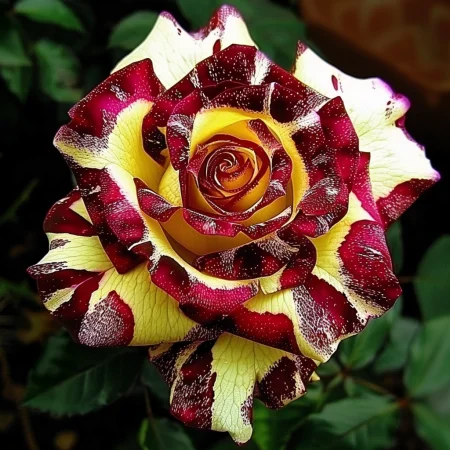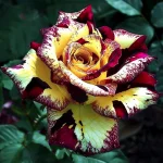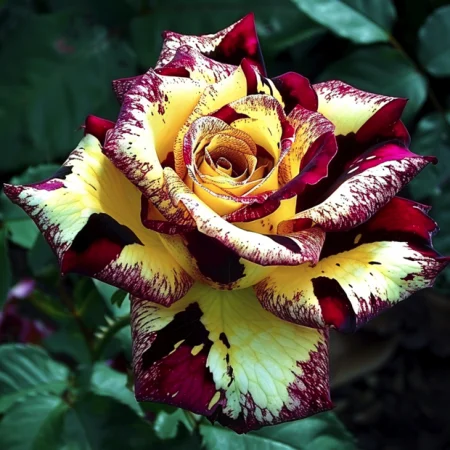 Ασυνήθιστη ποικιλία τσαγιού-υβριδικού τριαντάφυλλου με μοναδικά πολύχρωμα άνθη – σκούρα κόκκινα πέταλα με κίτρινες ή κρεμ ρίγες και κηλίδες. Τα άνθη είναι μεγάλα, με έντονο άρωμα, και ο θάμνος φτάνει τα 80–100 εκ. ύψος. Ιδανικό για κήπους και κομμένα άνθη, τραβάει την προσοχή με την εξωτική και «μαγική» εμφάνισή του.