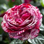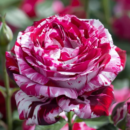 Ξεχωρίζει με μεγάλα, έντονα αρωματικά άνθη σε ροζ-κόκκινο με ακανόνιστες λευκές ρίγες. Ανθίζει άφθονα και επανειλημμένα κατά τη διάρκεια της σεζόν. Ο θάμνος είναι ζωηρός, φτάνει περίπου 1,5–2 μ., με καλά φυλλοφόρα κλαδιά και καλή αντοχή. Κατάλληλη για κήπους και για κομμένα άνθη.