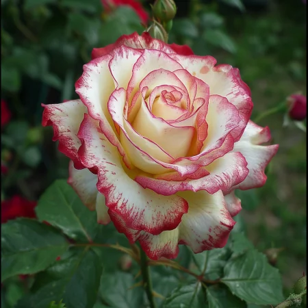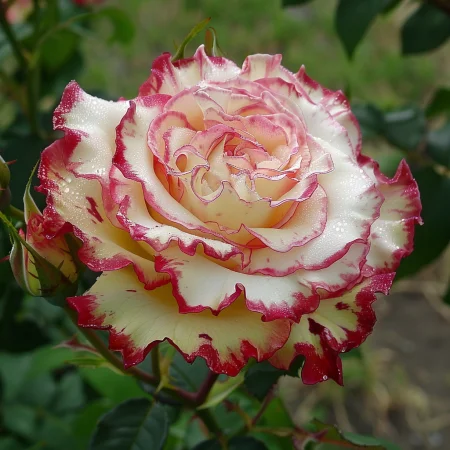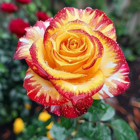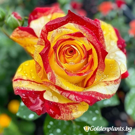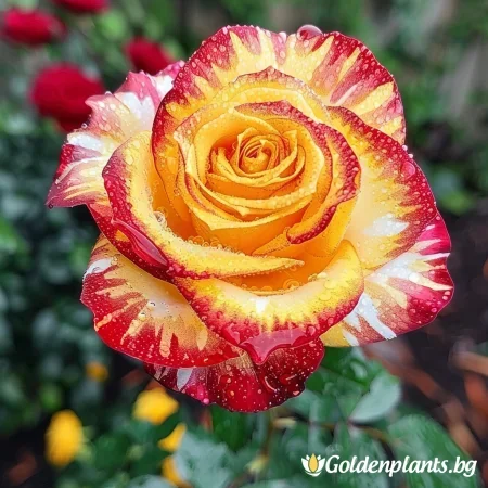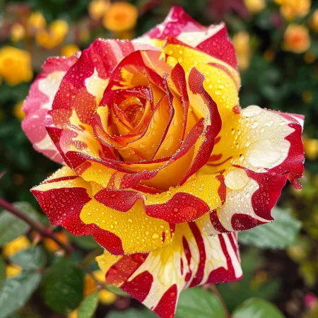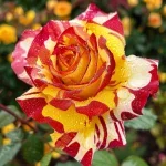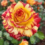 Όμορφη ποικιλία τριαντάφυλλου με μοναδικά, πολύχρωμα άνθη που θυμίζουν ουράνιο τόξο. Τα άνθη είναι έντονα και μεταβαίνουν μεταξύ αποχρώσεων ροζ, κίτρινου και πορτοκαλί, ιδανικά για διακοσμητικούς κήπους και μπουκέτα. Τα φύλλα είναι σκούρα πράσινα και γυαλιστερά, με υγιή και συμπαγή ανάπτυξη, κατάλληλη για θάμνους ή παρτέρια. Το τριαντάφυλλο έχει ευχάριστο, ελαφρύ άρωμα και ανθίζει άφθονα κατά τη σεζόν.